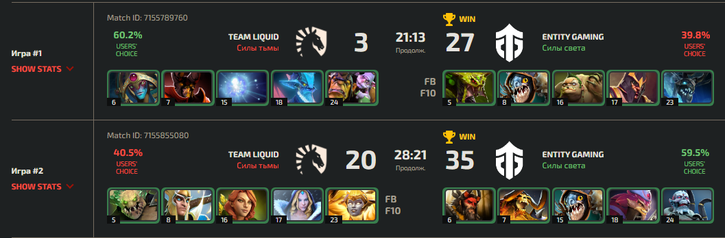 Еще до матча мы узнали, что GH из Nigma Galaxy подменит Boxi в Team Liquid. И эта замена сказалась на их игре. Entity подходили к этому матчу в статусе аутсайдера, однако это не помешало им победить вице-чемпиона ESL One Berlin Major 2023 со счетом 2:0.