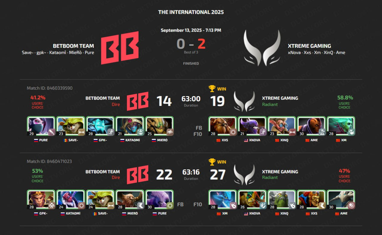 Günün sonunda BetBoom Team Xtreme Gaming'e karşı korkunç bir uyumsuz takım oyunu sergiledi ve iki haritada turnuvadan elendi. İlk haritada Xtreme Gaming Anti-Mage aldı, geç safhada öldürülemeyeceğini biliyordu. 50. dakikaya kadar dayandıktan sonra, Xtreme Gaming birkaç dövüş üst üste kazandı ve oyunu kolayca bitirdi. İkinci haritada BetBoom Team geç safhada kazanma şansına sahipti, Faceless Void ve Monkey King seçti. 58. dakikada BetBoom Team mükemmel bir dövüş gerçekleştirdi, Xtreme Gaming'in tüm core'larının buyback'lerini aldı, ancak bu süre zarfında bitiremedi, Pure'un aptalca hataları nedeniyle. Sonuç olarak, oyun hiper-geç safhaya geçti, burada Ame Sven ile birkaç vuruşta tüm düşman takımını öldürdü.