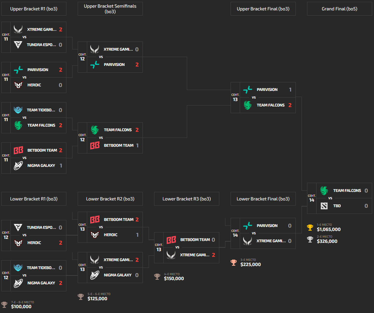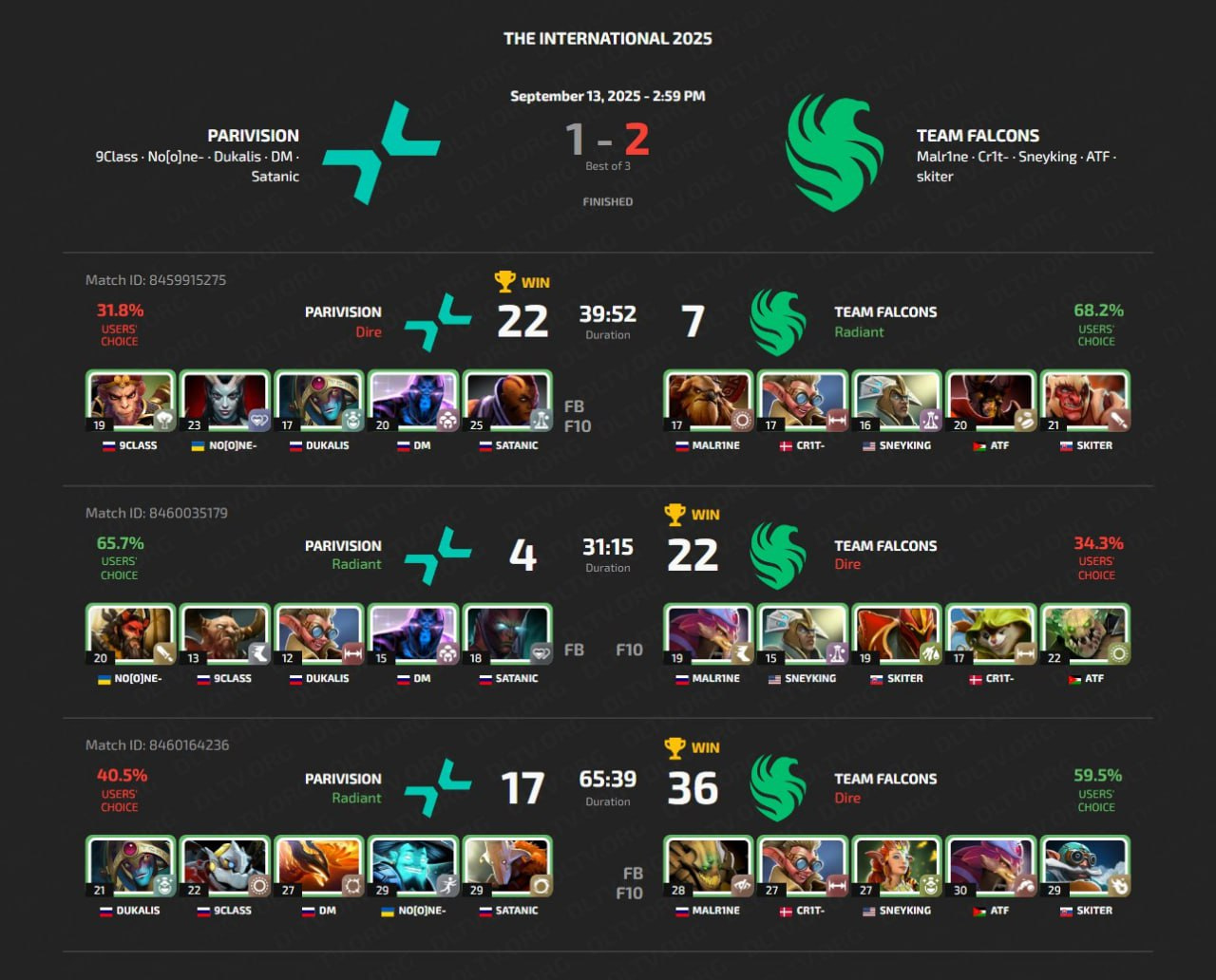 Sonra Team Falcons ve PARIVISION oynadı. Bu oyun turnuvanın en iyisi oldu. İlk haritada PARIVISION birkaç baş daha güçlü çıktı. Taslakları mükemmeldi, haritayı daha iyi farm yaptılar ve dövüşler gerçekleştirdiler.