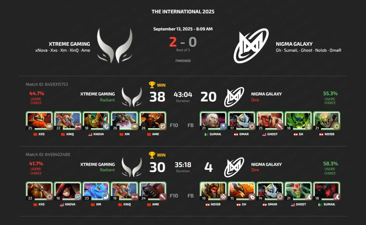The International 2025'in sondan bir önceki günü sona erdi. Team Falcons büyük finale çıktı. Nigma Galaxy ve Heroic turnuvadan 5-6. sırada ayrıldı. BetBoom Team Xtreme Gaming'e kaybetti ve 4. sırada yer aldı.