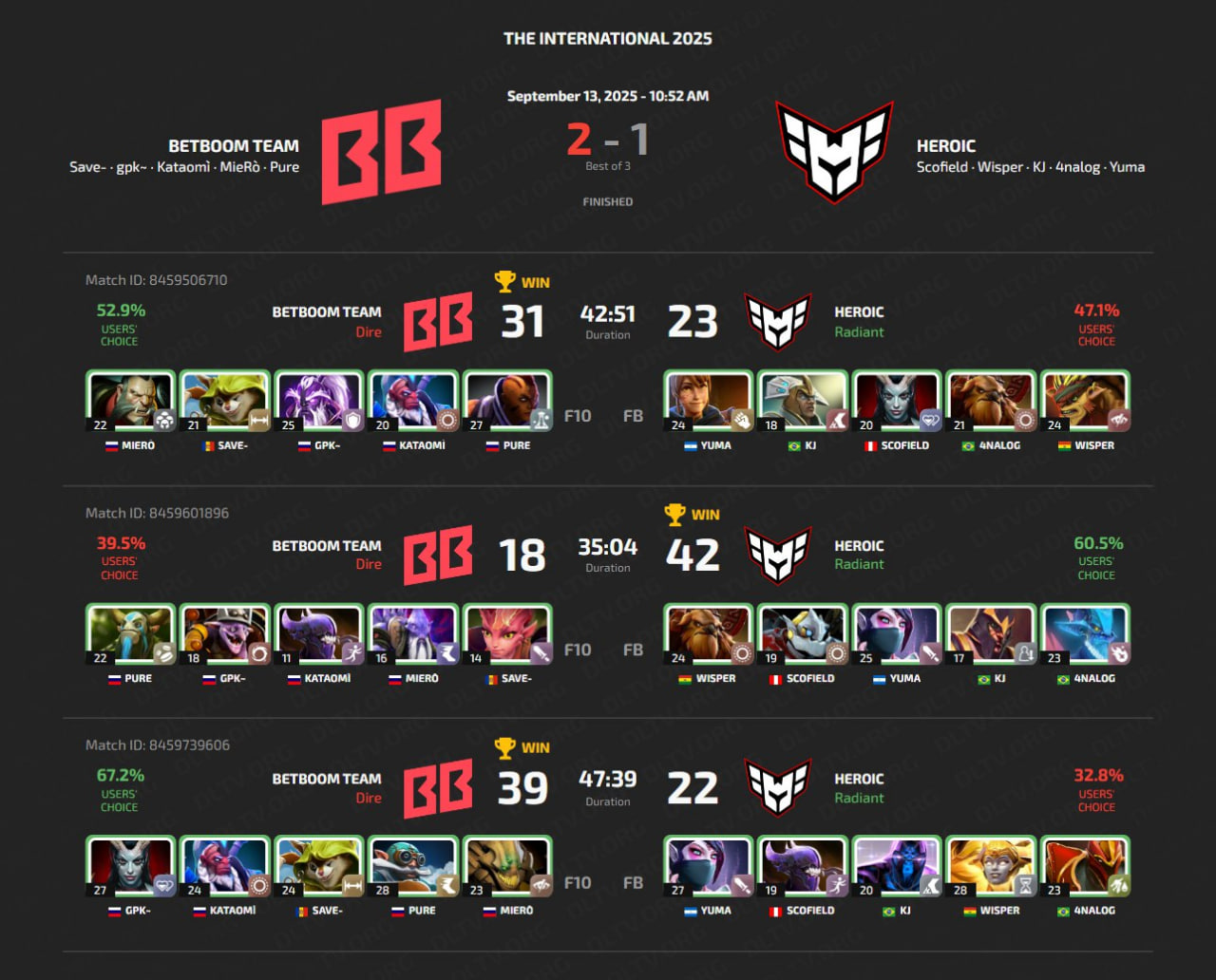 İkinci maçta BetBoom Team ve Heroic oynadı. İlk haritada Pure tekrar Anti-Mage aldı, ancak bu sefer takım 'Anti-Creep'i taşıyabildi. 40. dakikada gpk~ tek başına düşmanların Roshan çukuruna girdi, Aegis'i çaldı ve karşı saldırı gerçekleştirdi: