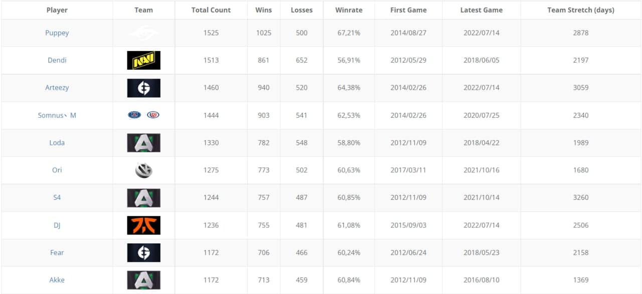 In addition to this record, ??Puppey set another one. He is currently the only player on the professional Dota 2 scene to win more than 1,000 maps for 1 team. His win rate is 67.21%.