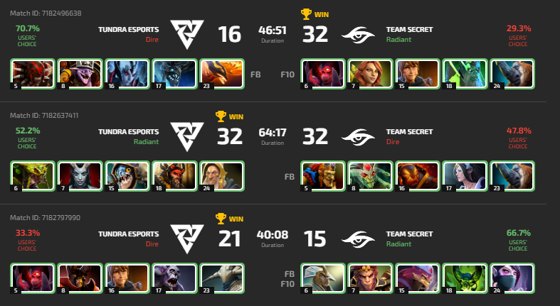 Серия вышла красочной на перевороты. На первой карте игры Team Secret сделали акцент на свою сложную линию. Они отправили туда Necrophos’а от Мирослава ‘Boom’ Бичана против Bloodseeker’а от Оливера ‘skiter’ Лепко и он вышел огромным. При этом, Паул ‘Armel’ Топиос в миде на Magnus стоял ровно против сигнатурного Timbersaw от Леона ‘Nine’ Кирилина. Несмотря на это, первый Рошан остался за Tundra Esports которые повели с преимуществом в 10 тысяч, но это не помешало Team Secret перевернуть игру. Reverse Polarity от Armel на нижней линии помог команде сделать четыре фрага, снести две стороны и впоследствии довести карту до победы.
